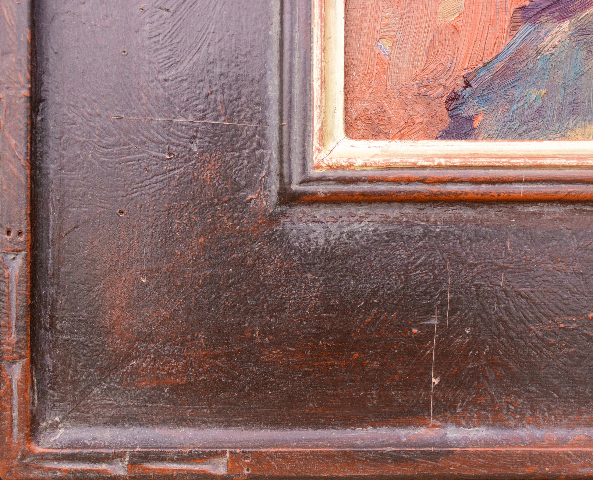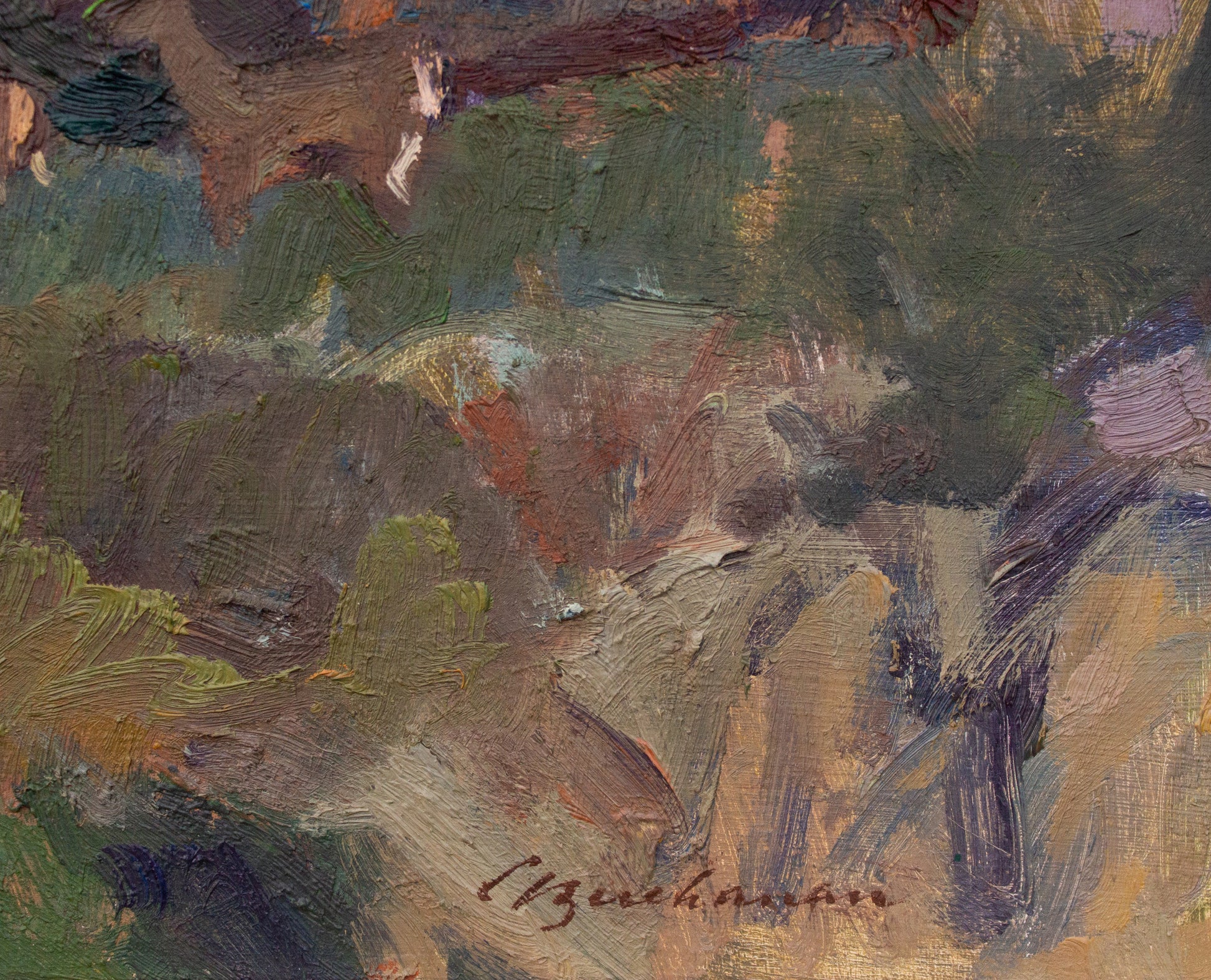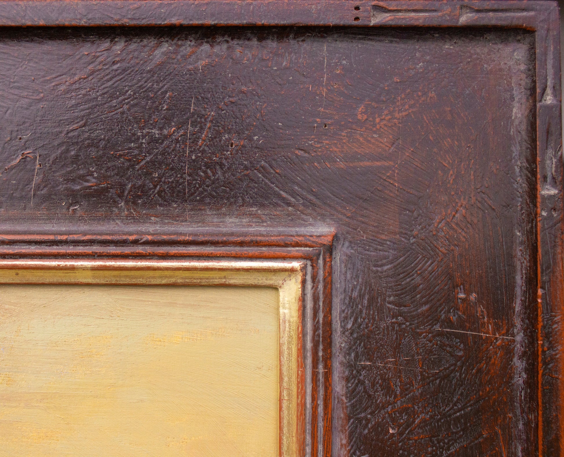 This is an original oil painting on panel, signed by Laurel. The built-from-scratch solid wooden frame accentuates the evening mood of the painting, with its bright 18k lip, and its rugged, hand rubbed and distressed finish. The outside dimensions of the frame are 25.5" height x 31.5" width, x 1" depth.