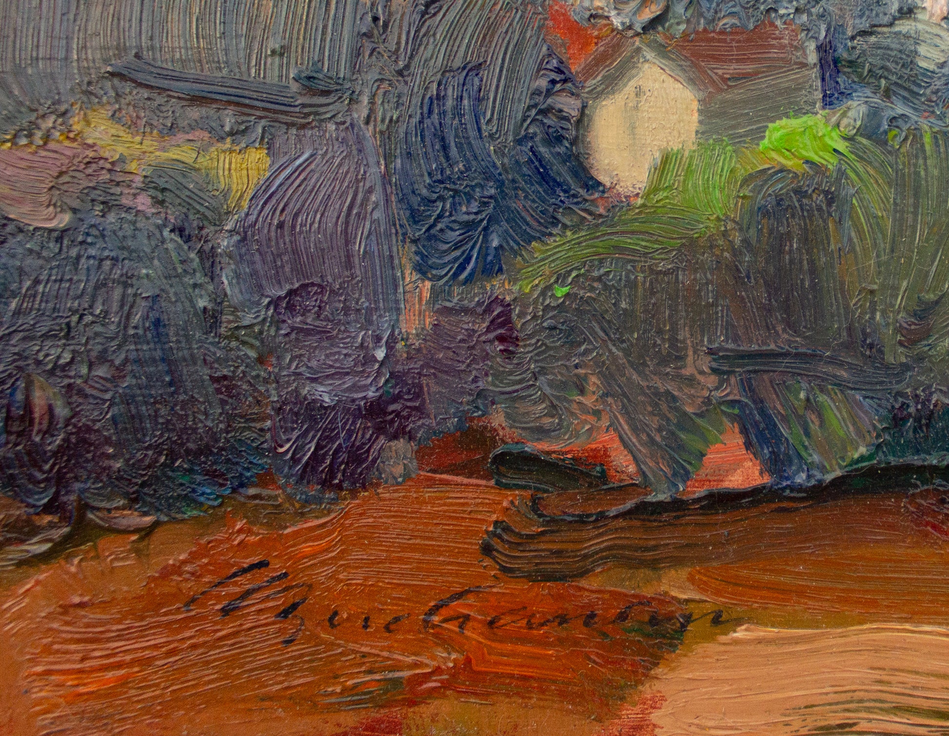 This is an original oil painting on hardboard panel, signed by Laurel. It is mounted in a solid oak natural finish floater frame. The outside dimensions of the frame are 12" height x 13" width x 3/4" depth.