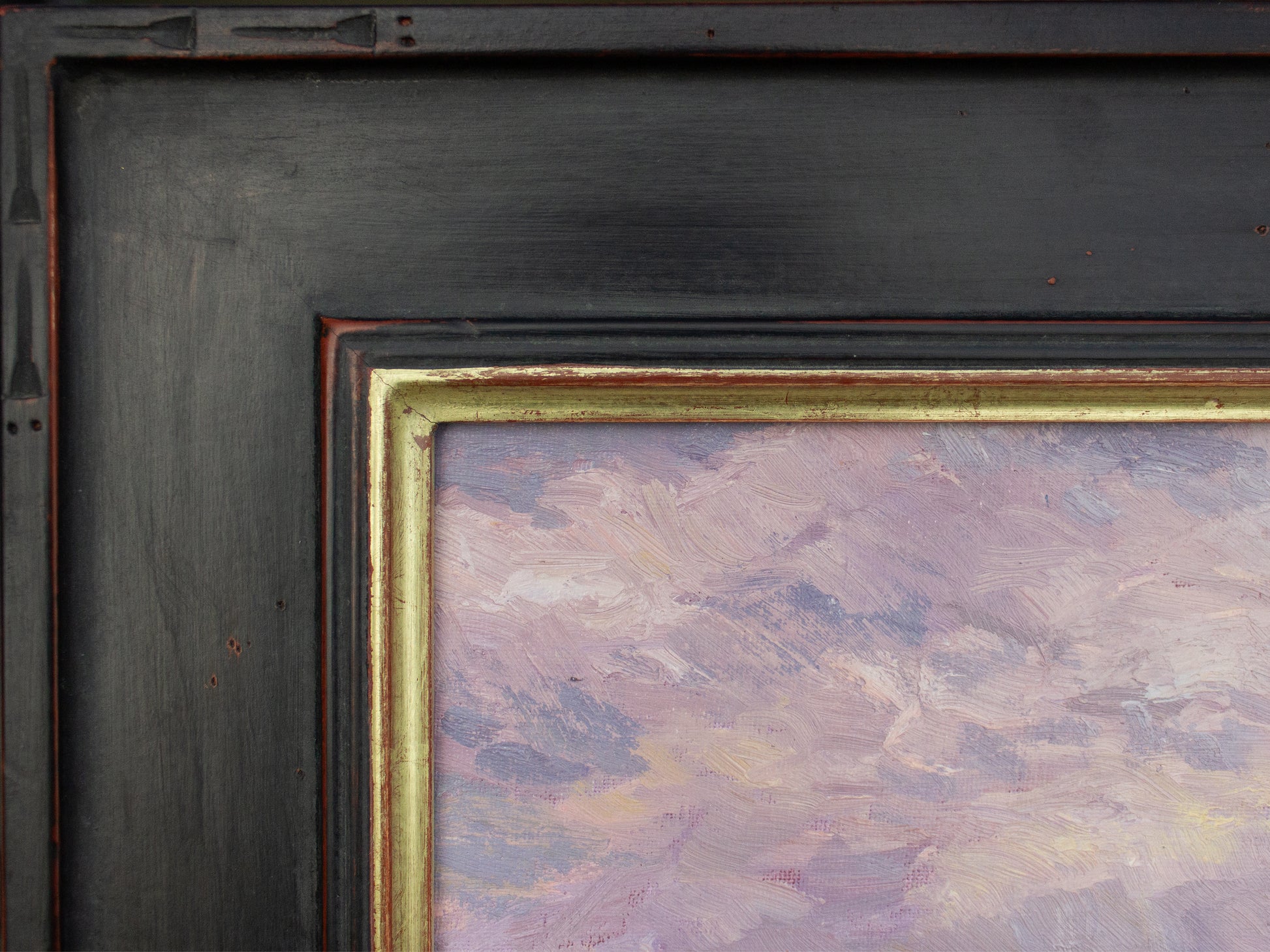 This is an original oil painting on canvas wrapped panel, signed by Laurel. It is framed in a handcrafted wood frame with an 18k hand-guilded lip. It has a red clay base painted black, distressed, with a subtle gray patina.