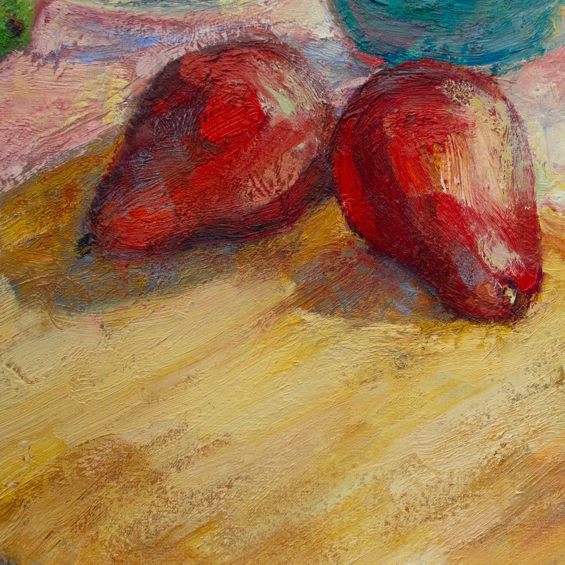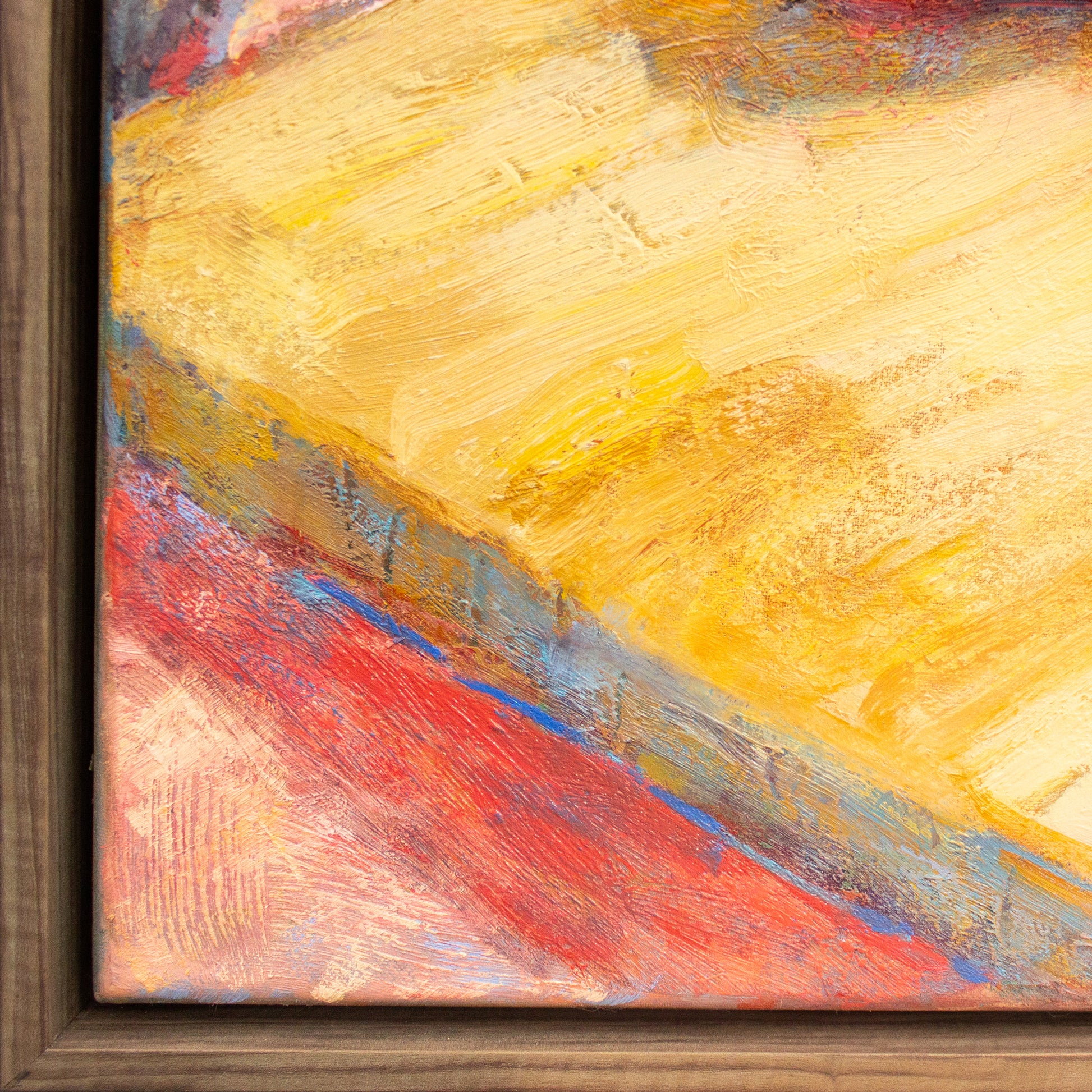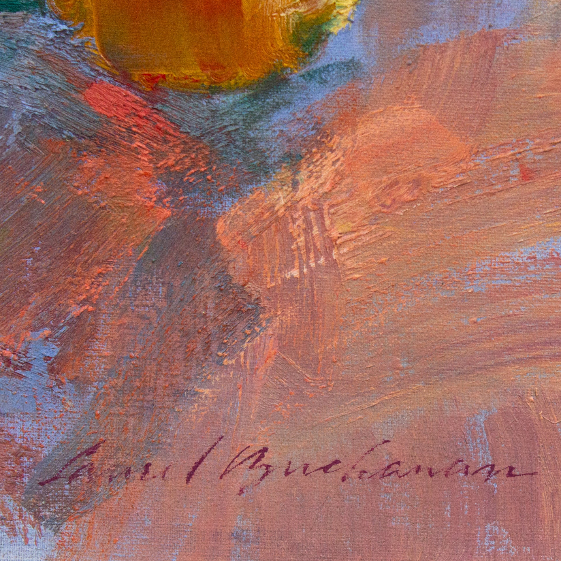 This is an original oil painting on linen canvas signed by Laurel Buchanan, framed in a light walnut wood grain floating frame. Outside dimensions of the frame are 38" x 38".