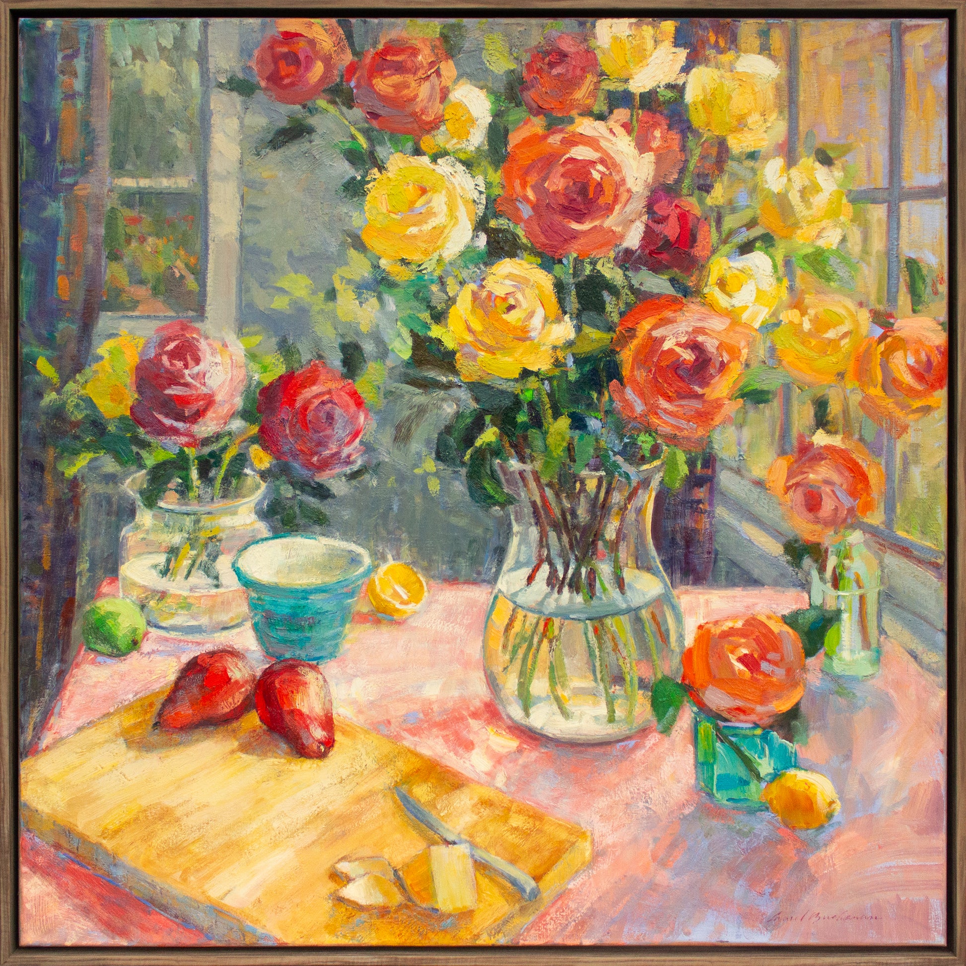 I bought these roses in February and painted them on a table with strong southern light. This painting was a real work of love for me, as the light was blazing through the window, not just illuminating the roses, but making everything in the room glow in the golden sunshine!