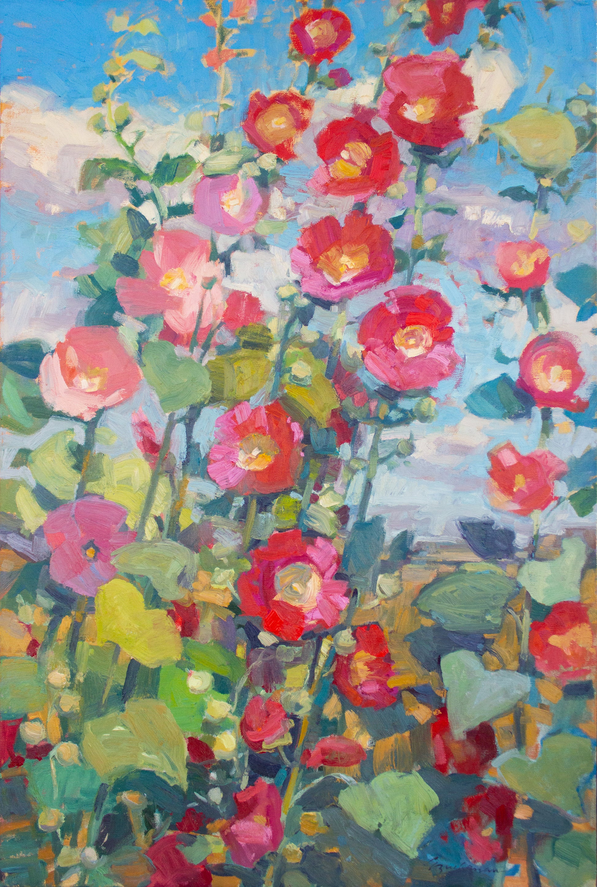These hollyhocks grew outside my studio window one summer. I imagined, instead of my studio windows in the background, the Central Oregon area of Powell Butte in the background behind the hollyhocks. (Although you can't see much behind the flowers, that is what is behind them!)