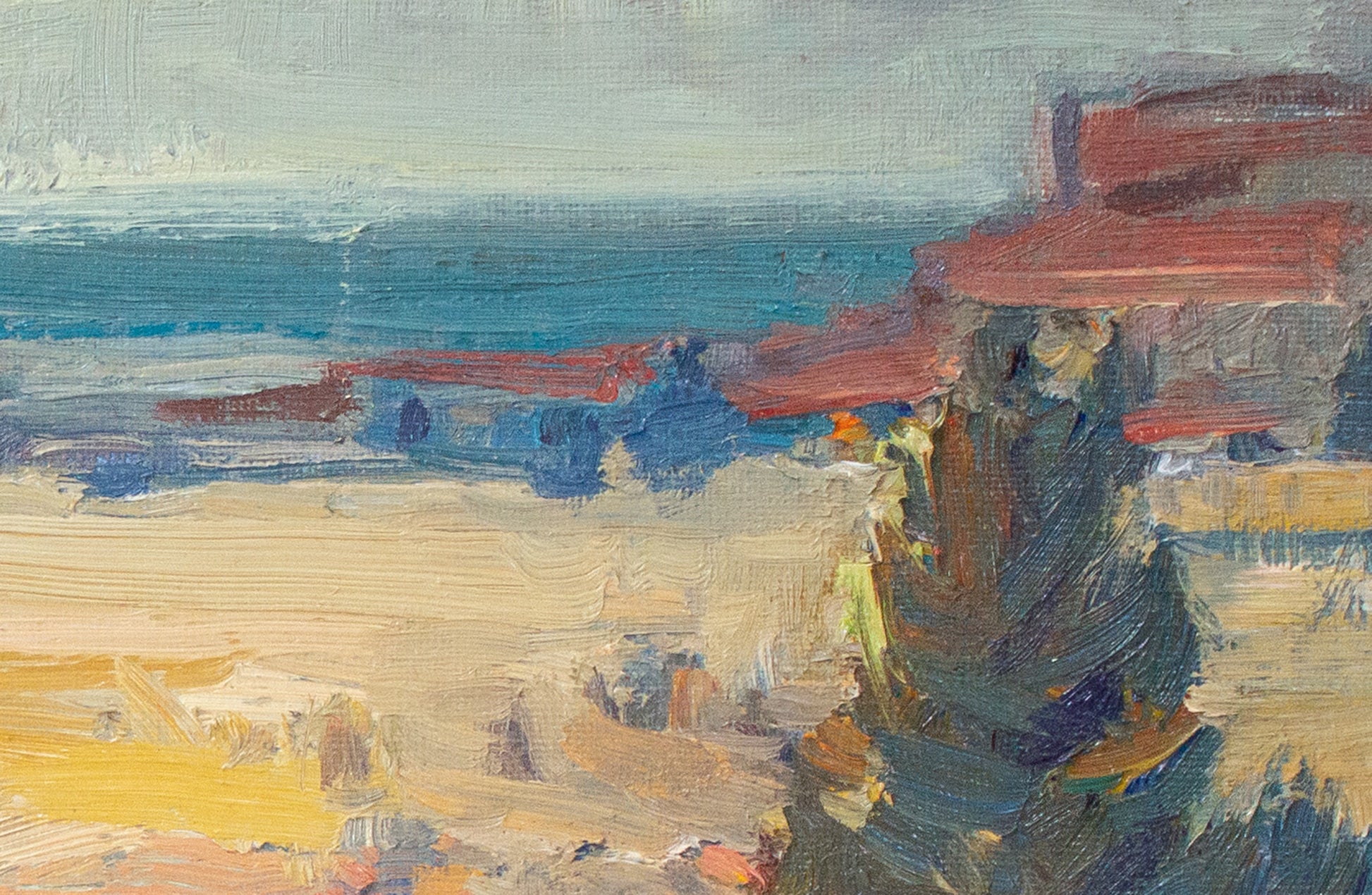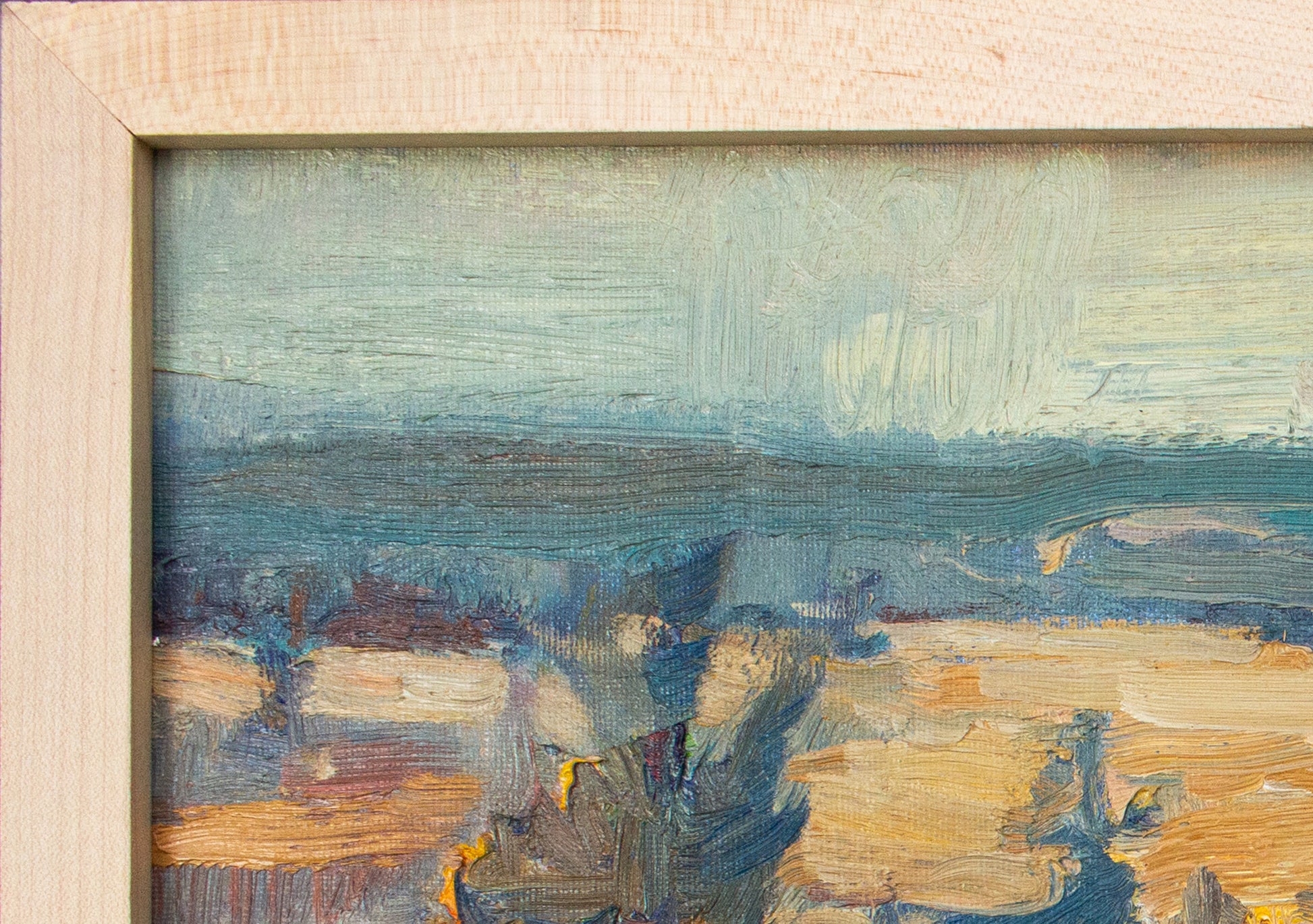 This is an original oil painting on canvas panel signed by Laurel. The solid natural maple frame is minimal, accentuating the expressive brush strokes of the painting. The outside dimensions of the frame measure 11" height x 16" width x 2" depth.