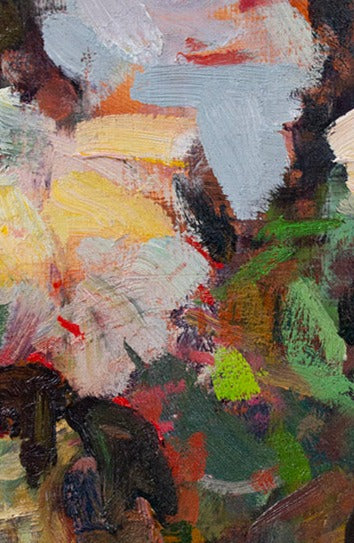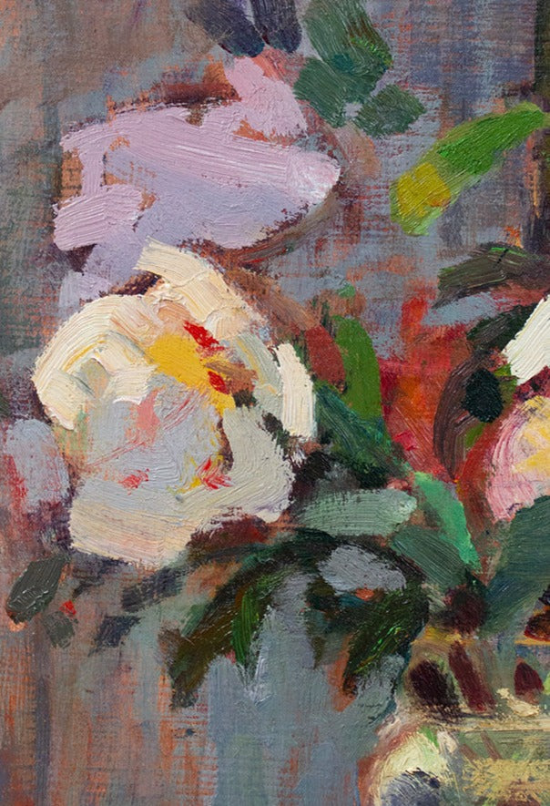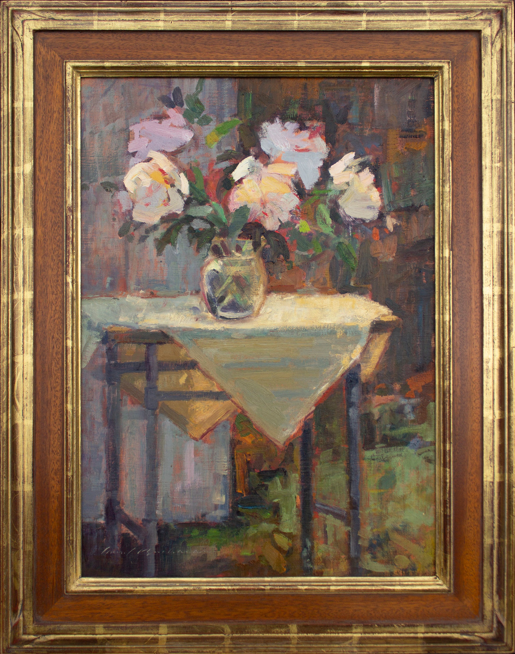 This painting was shown in the Salmagundi Club in New York City in an American Impressionist exhibit. I grew these flowers in my front yard and painted them in the back yard as they were backlit by the sun, causing the blooms and the table cloth to glow.