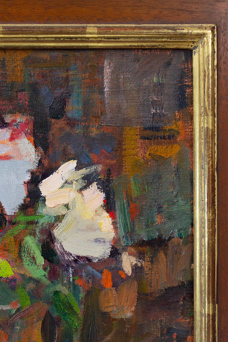 This is an original oil painting on panel signed by Laurel. It is in a solid walnut hand crafted frame with 18k gold leafing and carved corners. The outside measurements of the frame are 31.5" x 24.5".