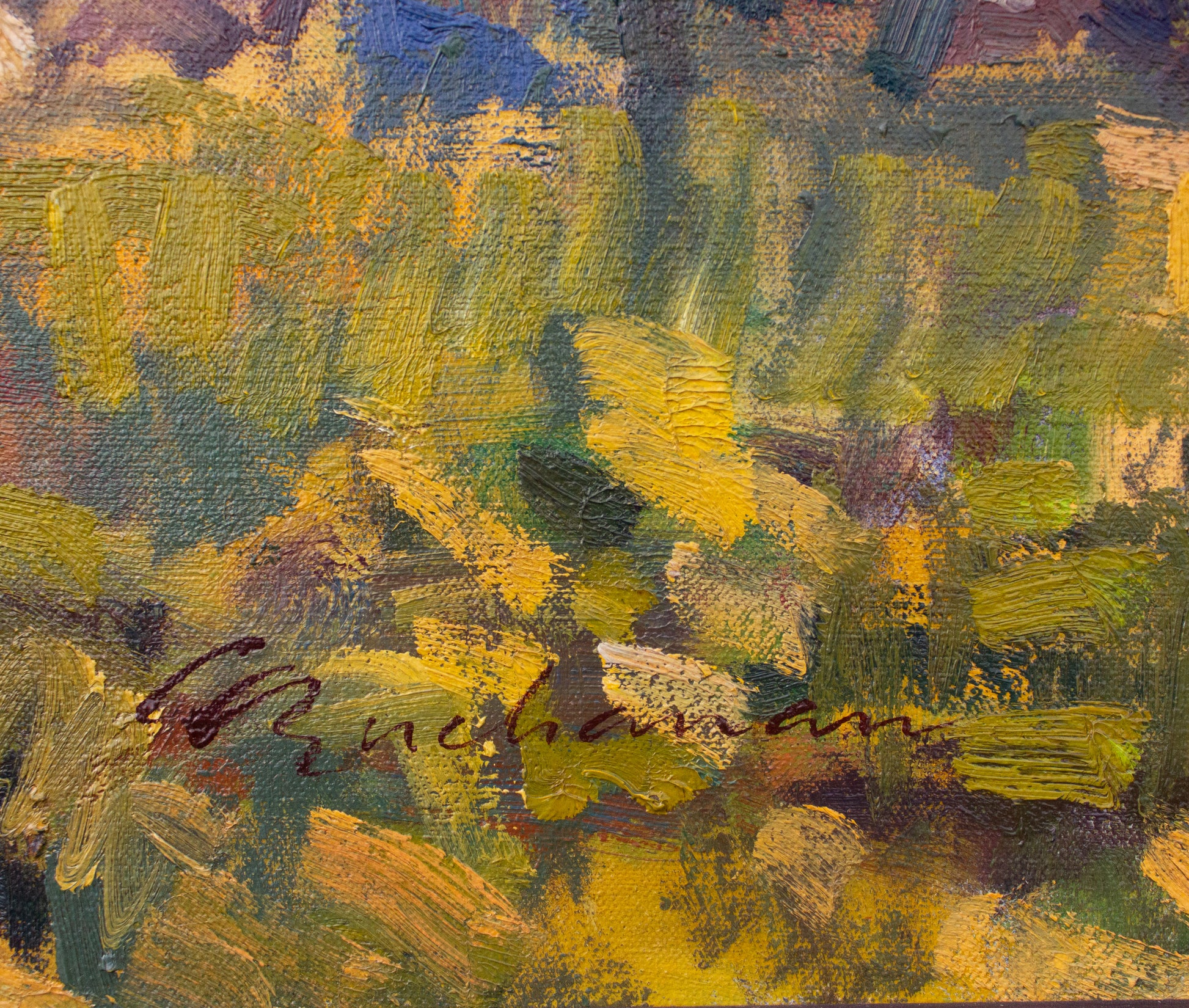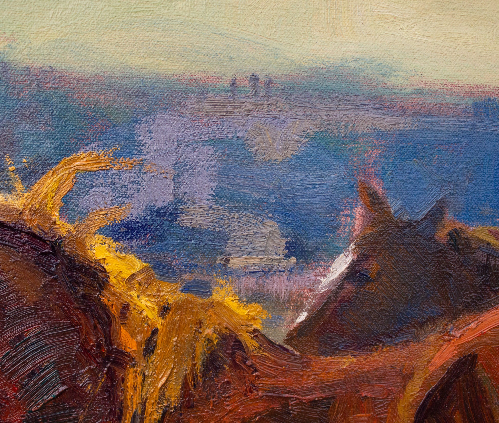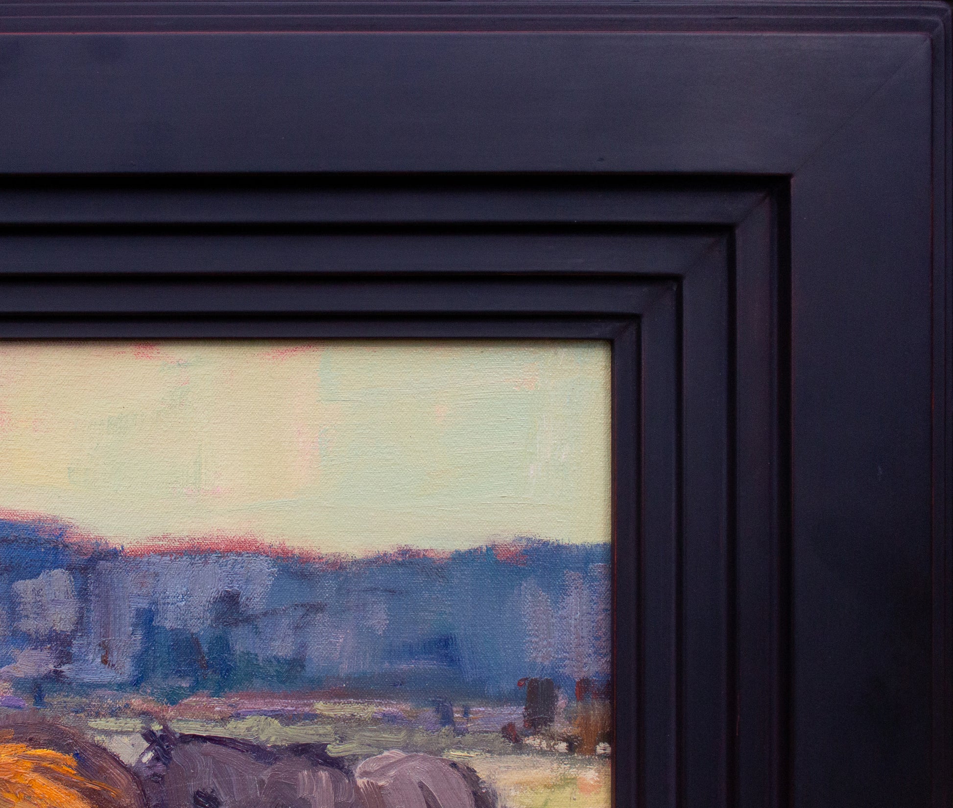 This is an original oil painting on stretched heavy cotton canvas. It is signed by Laurel and framed in a handcrafted wooden frame with a wide, unique profile, and a red bole painted black. Framed size is 33" height x 39" width x 2" depth.