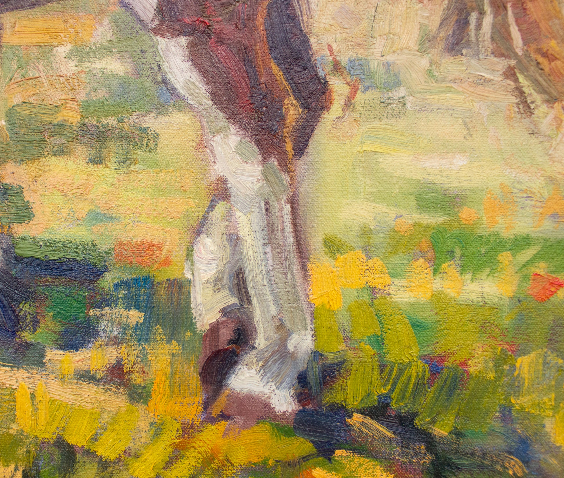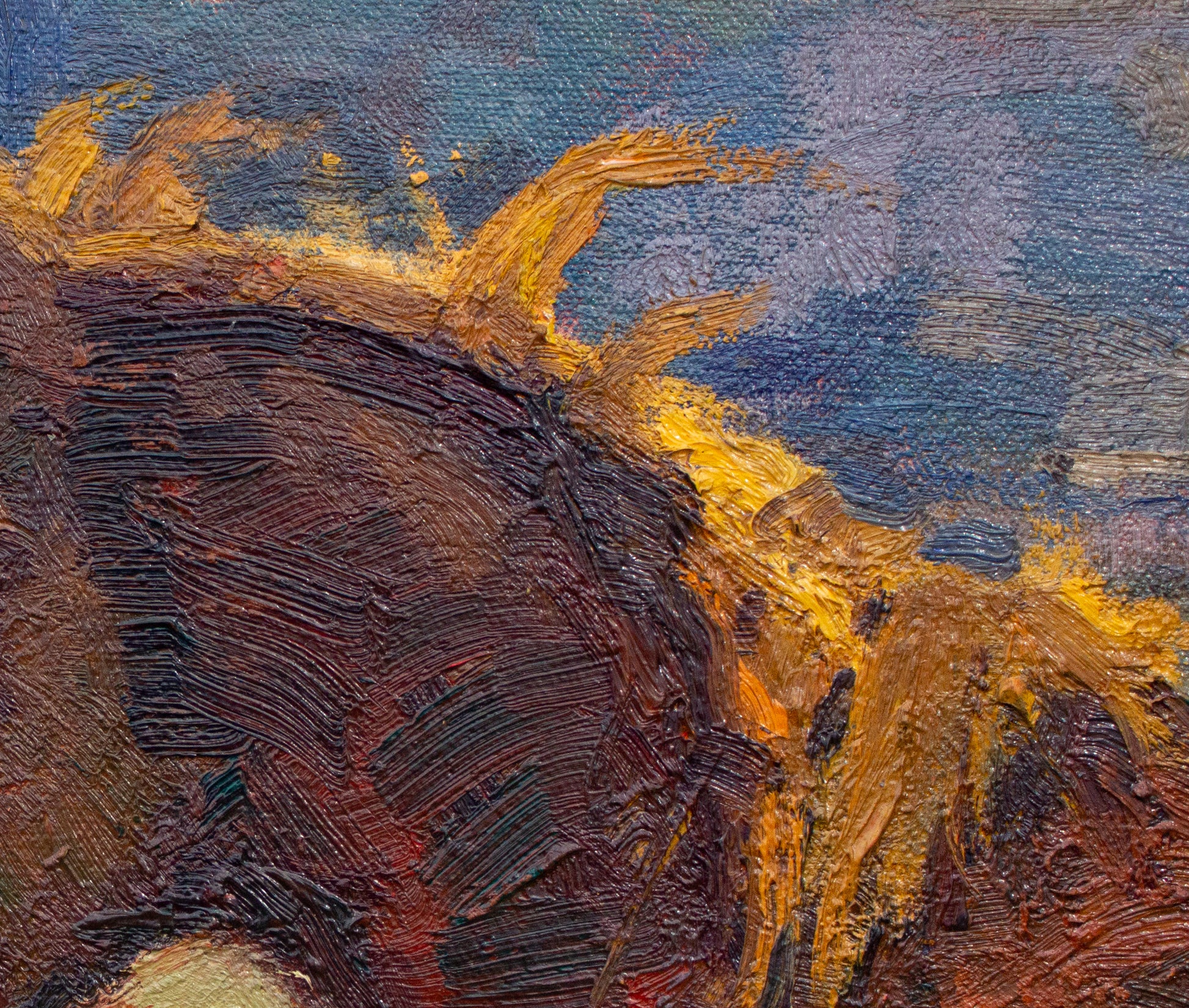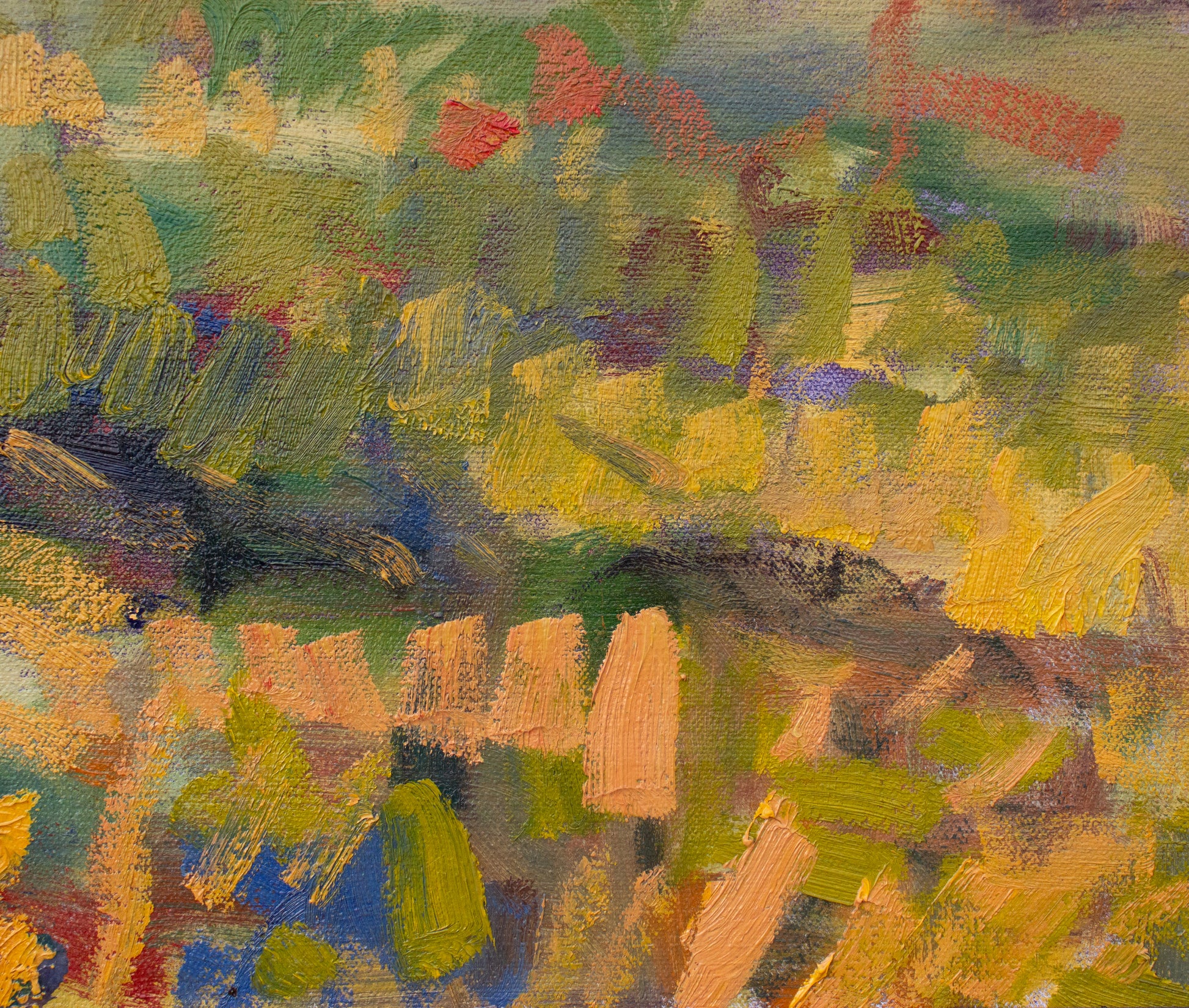This is an original oil painting on stretched heavy cotton canvas. It is signed by Laurel and framed in a handcrafted wooden frame with a wide, unique profile, and a red bole painted black. Framed size is 33" height x 39" width x 2" depth.