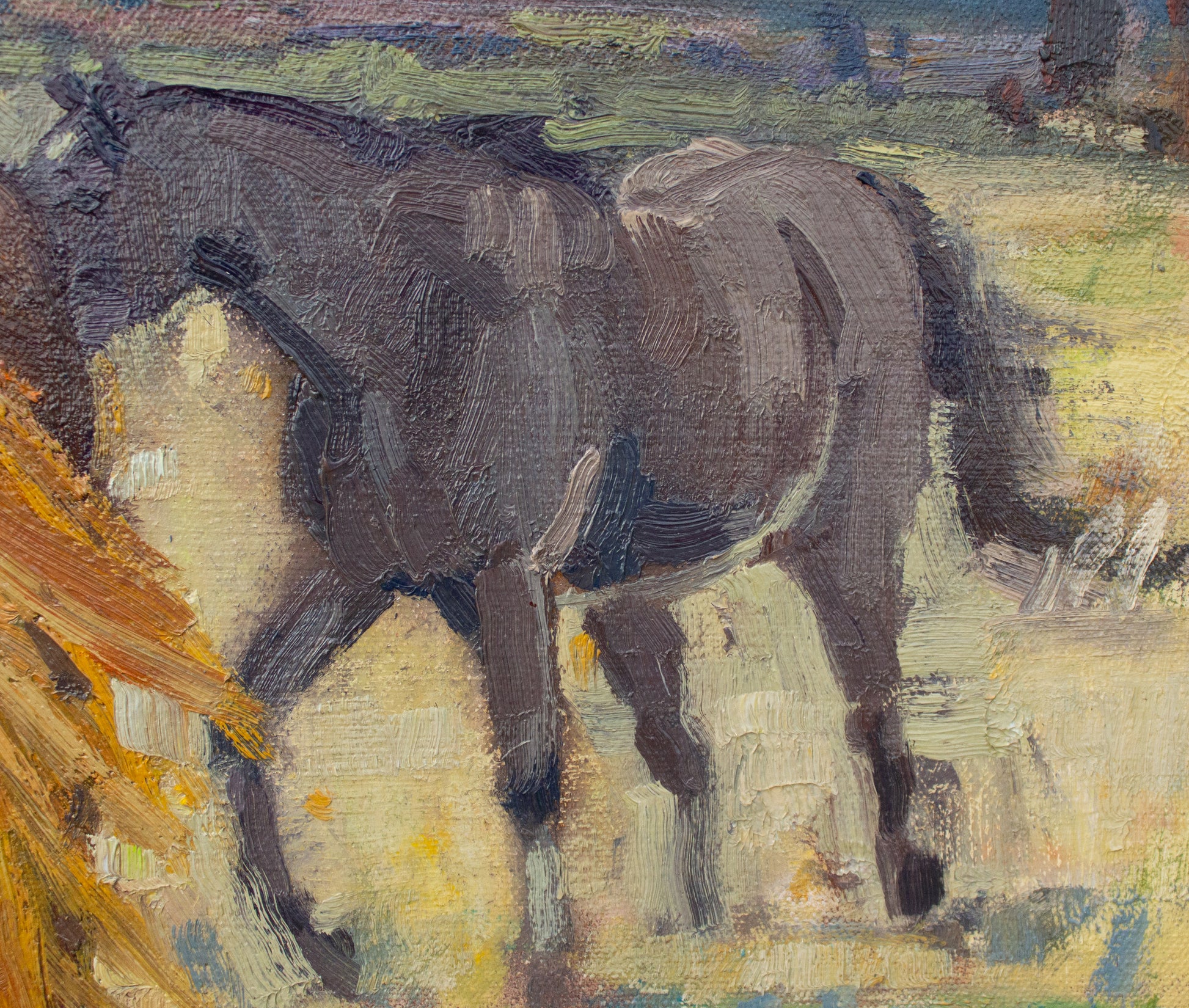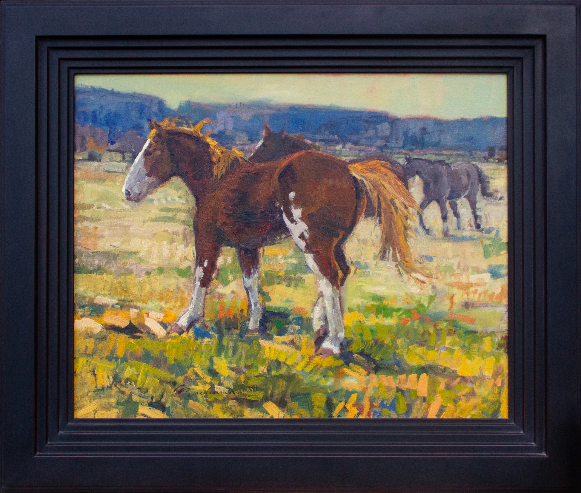 I was painting views of the Cascade mountain range from Prineville one late winter day when these horses began frisking about the pasture. I had my good camera with me and caught them in action, painting this version in my studio.